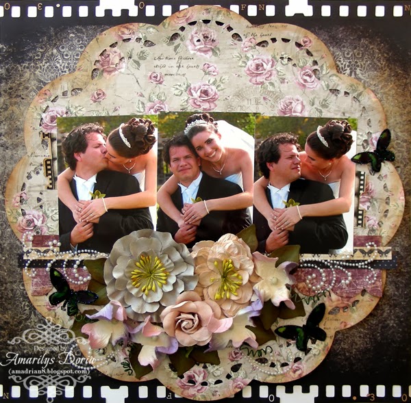 Finally, for this slightly more elegant wedding page, I used the black background paired with a pretty purple roses paper and flowers from both the Flower Add On Kit and the main kit.The bling is from my stash and I handmade the butterflies to match the rest of my wedding album.